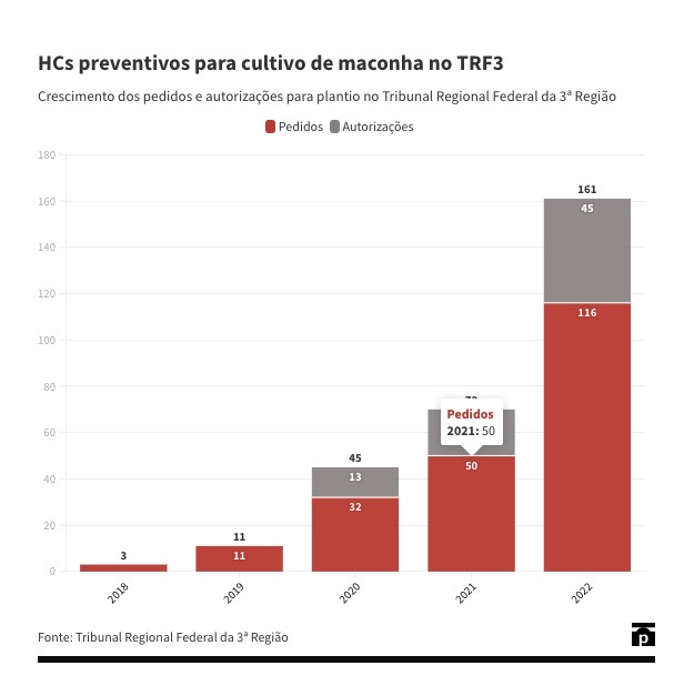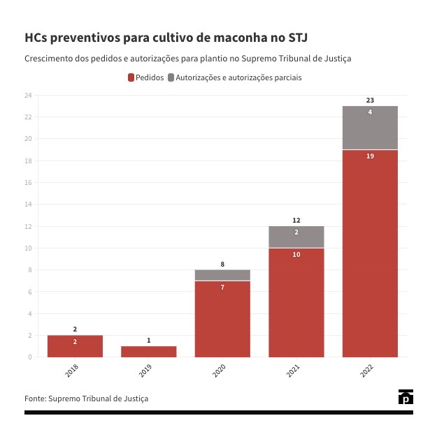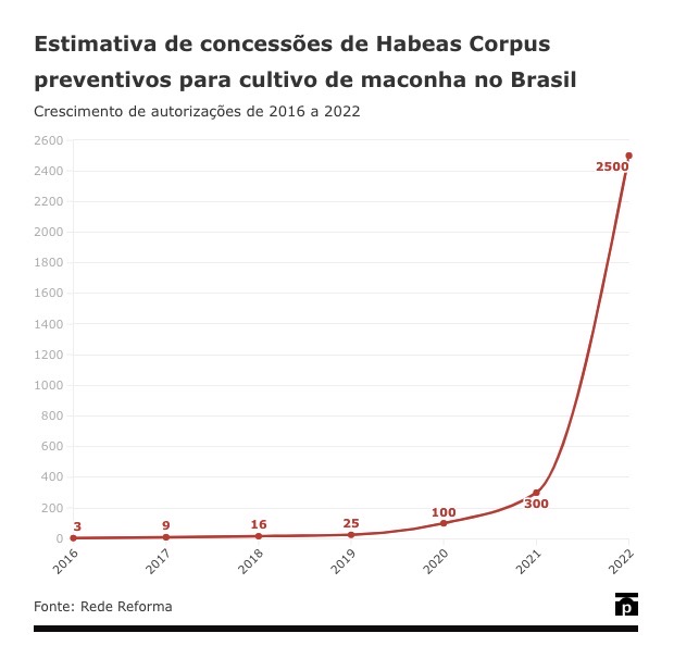 Informações fornecidas por Emílio Figueiredo, também advogado da Reforma, mostram que houve uma multiplicação na concessão de HCs entre 2016 e 2022 no Brasil, saltando de 3 em 2016 para 2.500 no ano passado. Ainda que expresse o crescimento real nas autorizações judiciais, o número é subdimensionado, uma vez que a estimativa é feita apenas com base nas autorizações obtidas pela Reforma.